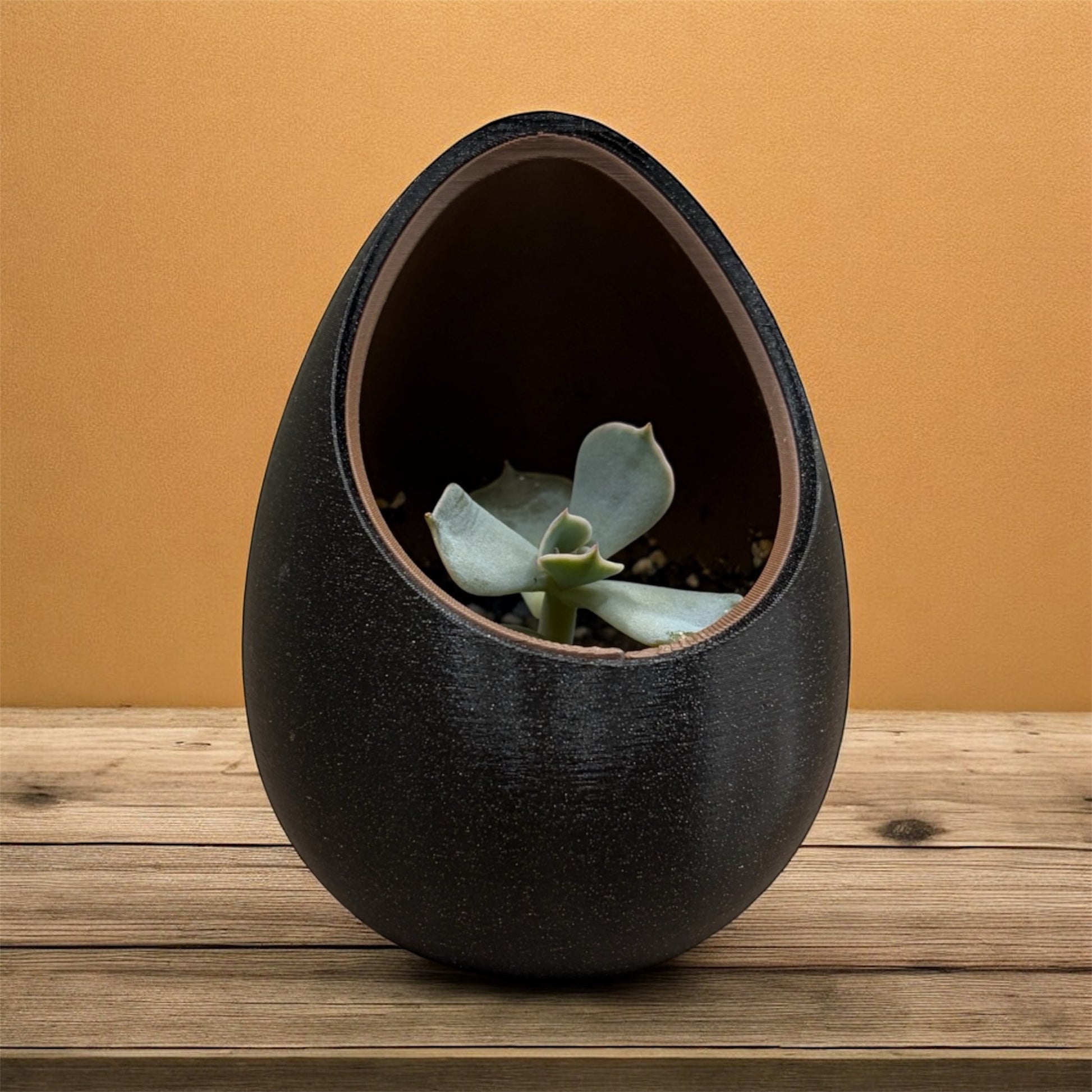 Plant: Discover the bold beauty of Echeveria succulents paired with a striking egg-shaped planter that demands attention. These rosette-forming gems showcase lush green leaves kissed with purple undertones and grow at their own leisurely pace, rewarding patient plant parents with impressive mother plants and propagation opportunities.